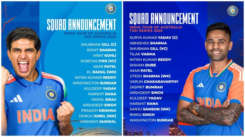 ഏകദിന സ്ക്വാഡ്: Gill (C), Rohit, Kohli, Shreyas (VC), Axar, Rahul, Nitish, Washi, Kuldeep, Harshit, Siraj, Arshdeep, Prasidh, Jurel (WK), Jaiswal