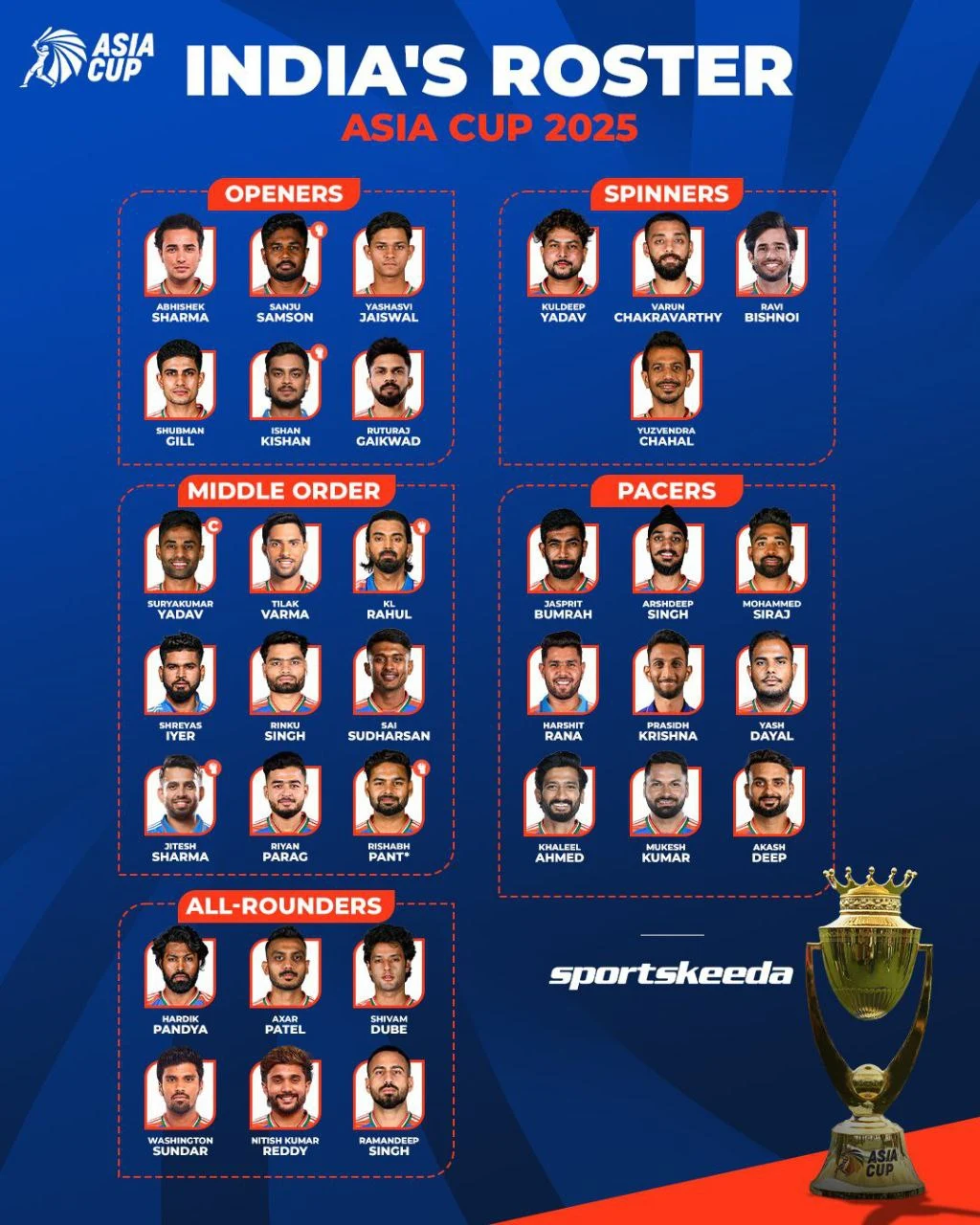 വരാനിരിക്കുന്ന ഏഷ്യാ കപ്പിനായുള്ള ഇന്ത്യൻ സാധ്യതാ ടീമിന്റെ പട്ടിക പുറത്ത്. ക്രിക്കറ്റ് ആരാധകർ ഏറെ പ്രതീക്ഷയോടെ കാത്തിരുന്ന സഞ്ജു സാംസൺ ടീമിലിടം നേടിയപ്പോൾ, സീനിയർ പേസർ മുഹമ്മദ് ഷമി ഒഴിവാക്കപ്പെട്ടത് അപ്രതീക്ഷിതമായി. സ്‌പോർട്‌സ് കീഡ തയാറാക്കിയ ഈ സാധ്യതാ പട്ടിക ഇപ്പോൾ സമൂഹമാധ്യമങ്ങളിൽ വലിയ ചർച്ചയായിരിക്കുകയാണ്.